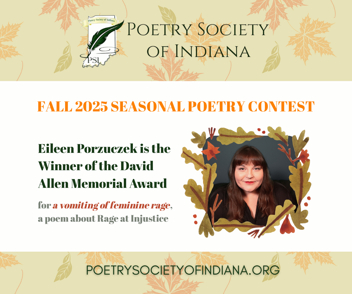 This award was given to Eileen for her poem “a vomitting of feminine rage” by the Poetry Society of Indiana. Eileen’s poem will be in their yearly anthology.